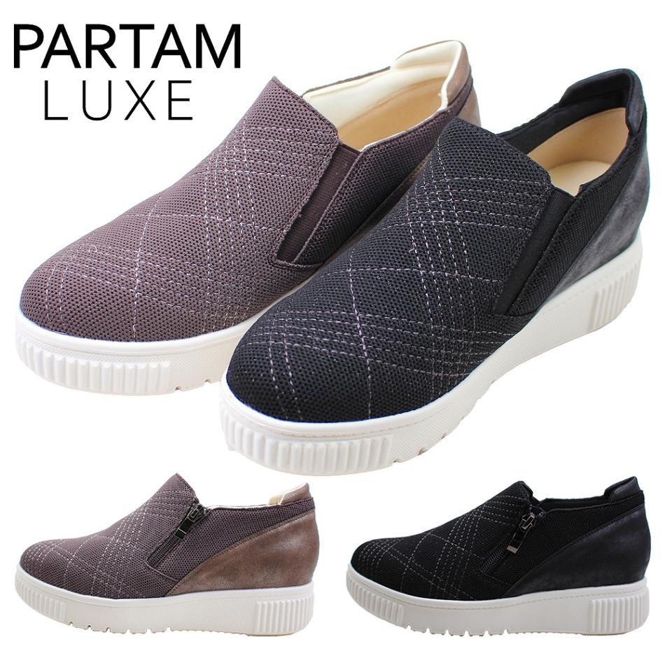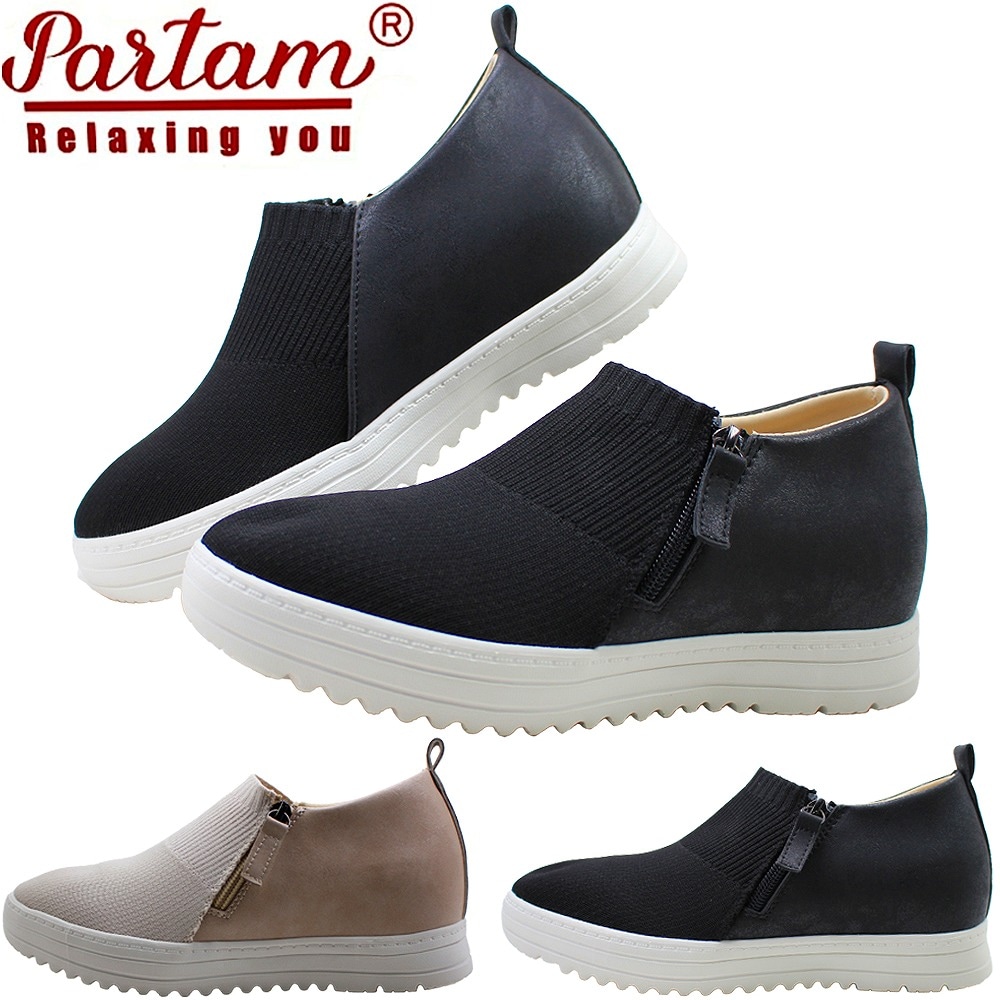 カジュアルシューズ スリッポン レディース ブラック グレー ストライプ ファスナー 厚底 パータム PARTAM 16 幅広3E おしゃれ 【レディース】