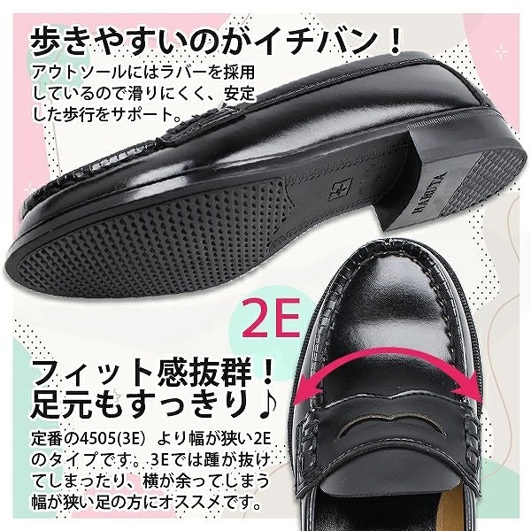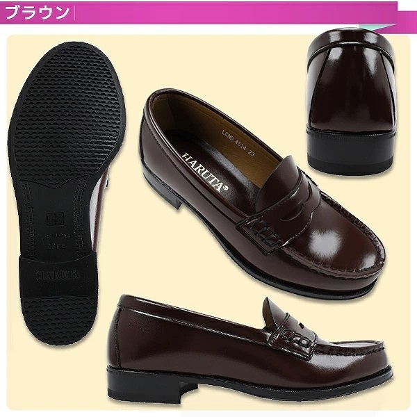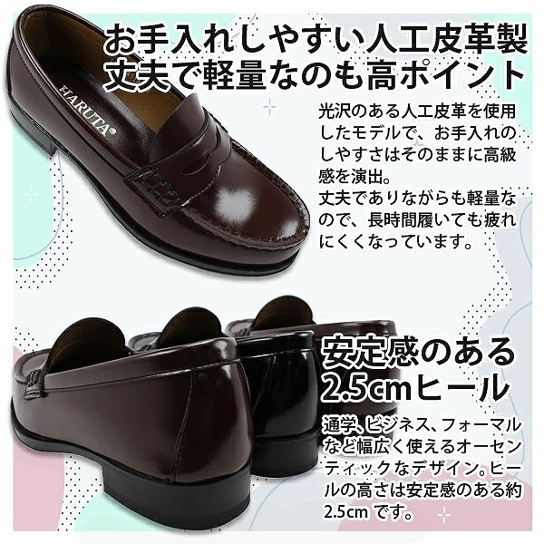 | 商品の特徴 | 「ハルタ」より年代を超えて愛用されている定番のコインローファー。いつの時代も色褪せないオーセンティックなデザインが魅力です。光沢のある人工皮革を使用したモデルで、お手入れのしやすさはそのままに高級感を演出。丈夫でありながらも軽量なので、長時間履いても疲れにくくなっています。2Eタイプだからフィット感が良く、足元をすっきり見せてくれるのがうれしい。アウトソールにはラバーを採用しているので滑りにくく、安定した歩行をサポート。普段使いから通学まで幅広いシーンで活躍してくれるので、2足目におすすめしたいアイテムです。日本製 ヒール丈約25mm 2Eワイズ![]() |