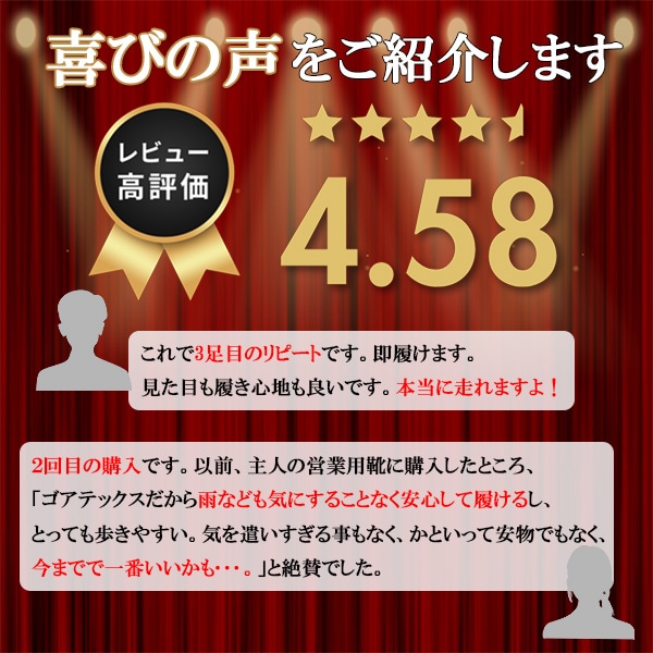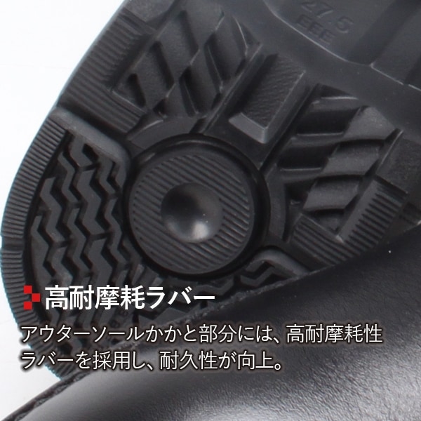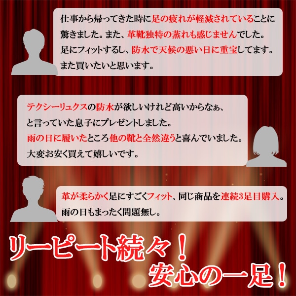 | 商品の特徴 | ゴアテックス メンブレン採用:透湿・防水性素材をライニングに採用し、ジメジメした雨の日のストレスを軽減します。 [型番] ●TU-8001 ブラック 外羽根 プレーントゥ ●TU-8002 ブラックorブラウンorワイン 内羽根 ストレートチップ ●TU-8003 ブラック 外羽根 スワールトゥ ●TU-8004 ブラック モンクストラップ ●TU-8005 ブラックorブラウン 内羽根 ストレートチップ ウイズ:3E相当 ※TU-8005は4E相当 ●クッション性と屈曲性に優れ、軽量感のあるE.V.A.インジェクションソール採用。 ●踏みつけ部に「低硬度ラバー」、かかと部に「高耐磨耗ラバー」を採用し、凹凸感のある意匠にてグリップ性と耐久性に配慮。 ●靴内環境を快適にするために、インナーソールつま先裏に消臭繊維「モフ」、インナーソール表面に抗菌繊維を採用(JIS L1902:菌液吸収法)。 ふんわりした足当たりのやわらかく、へたりにくい中敷を採用し、歩行時の体圧を足裏全体で支持。 ●つちふまず部分にフィットする土ふまずパッド。 ●足首をやさしく包み込む履き口スポンジパッド。 ●ベロ裏クッションを採用し、足の甲にやさしくフィット。 ●アッパーにアンティーク加工を施した、やわらかな牛革。 ●履き口(内側)にゴアを使用した、脱ぎ履きが快適なデザイン。 ●裏ハトメ仕様なので、紐を締めやすい。 ![]() |